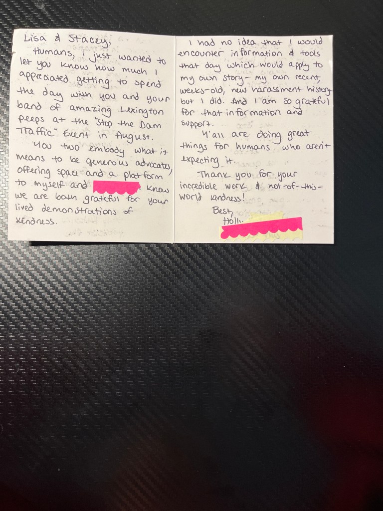 Humans, I just wanted to let you know how much I appreciated getting to spend the day with you and your band of amazing Lexington peeps at the “Stop the Dam Traffic” event in August.
